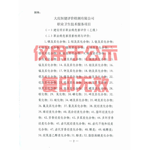 公司2007年9月**獲得黑龍江省衛(wèi)生廳職業(yè)衛(wèi)生技術(shù)服務(wù)機(jī)構(gòu)乙級(jí)資質(zhì)證書(黑衛(wèi)職認(rèn)字[2007]第093號(hào));2012年9月10日獲得黑龍江省衛(wèi)生廳公共場(chǎng)所技術(shù)服務(wù)機(jī)構(gòu)**技術(shù)能力考核合格批復(fù)文件,成為全省首家合法開展公共場(chǎng)所檢測(cè)的技術(shù)服務(wù)機(jī)構(gòu)。2015年6月通過黑龍江省安全生產(chǎn)監(jiān)督管理局續(xù)展審查,資質(zhì)證號(hào)為黑安職技字(2015)第B-0011號(hào);2018年5月月通過黑龍江省安全生產(chǎn)監(jiān)督管理局續(xù)展審查,新資質(zhì)證號(hào)為(黑)安職技字(2018)第B-0011號(hào),有效期*2021年6月4日。職業(yè)衛(wèi)生檢測(cè)、評(píng)價(jià)的業(yè)務(wù)范圍包涵石油和天然氣開采業(yè);金屬、非金屬礦采選業(yè)和工程建筑業(yè);冶金、建材;化工、石化及醫(yī)藥;輕工、紡織、煙草加工制造業(yè);機(jī)械、設(shè)備、電器制造業(yè);電力、燃?xì)饧八纳a(chǎn)的供應(yīng)業(yè);運(yùn)輸、倉(cāng)儲(chǔ)、科研、農(nóng)林、公共服務(wù)業(yè)等八大行業(yè)100個(gè)項(xiàng)目。是省內(nèi)服務(wù)范圍較為**的職業(yè)衛(wèi)生技術(shù)服務(wù)機(jī)構(gòu)之一。